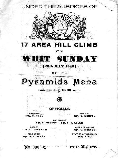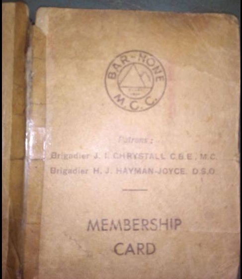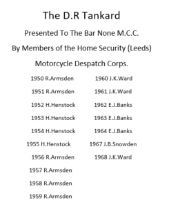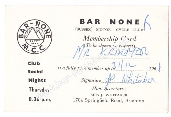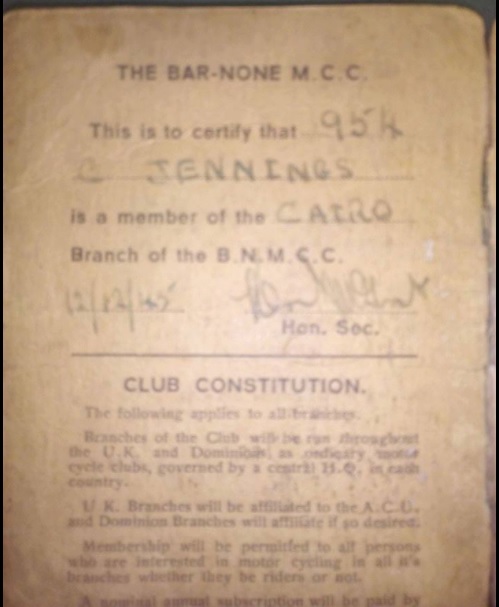 Archive and paperwork for the Bar-None Motorcycle Club Archive and paperwork WW2 Original Membership Card C. Jennings original membership card from the Bar-None Club Cairo Egypt 1945 Archive and paperwork Post War July Scramble Programme for July Scramble at Owen House Farm Mobberley Cheshire some time pre-1971 Membership card for Sussex Club 1961 Ashtray trophy 1950 The D.R. Tankard Owned by Brian Marks David Campbell’s Membership Card and receipt for the Altrincham Branch Monthly Bulletin produced in the 1950's by the Worthing Branch Letter and photos from Peter Glover in The Classic Motorcycle 2005